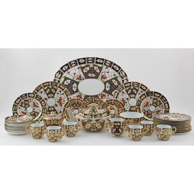 A Royal Crown Derby tea service 1st half 20th century, decorated in the Imari palette in pattern 2451, most with date codes for 1911. Comprising: a tray, a teapot and cover, a sugar bowl and cover, a slop bowl, a stand, a milk jug, two large plates, twelve small plates, twelve saucers and twelve cups. (46)