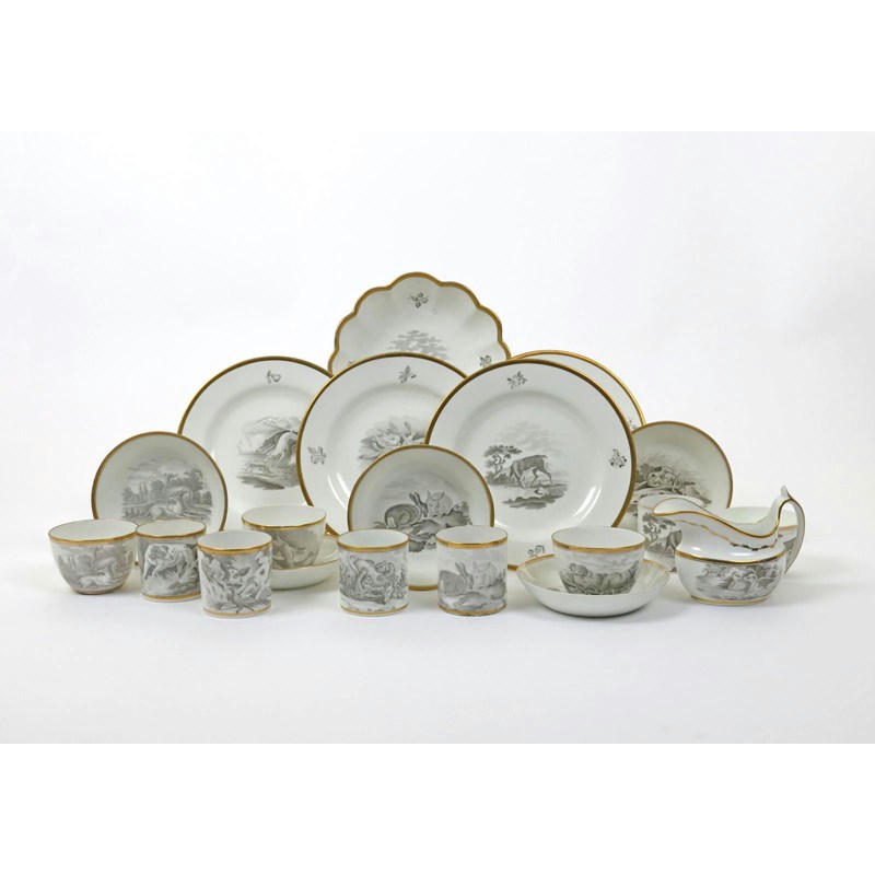 A Spode combined part service c.1810, bat-printed in patterns including 557 and 1222 with various scenes of animals including sleeping dogs, dead game, deer, leopards, rabbits. Comprising: a shell-shaped dessert dish, a milk jug, four plates, four tea cups, five coffee cans and five saucers. (20)