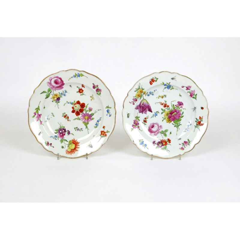 A pair of Meissen Marcolini plates c.1775, boldly decorated with large flower sprays and single scattered stems, blue crossed swords and star mark, a little wear, 24cm. (2)