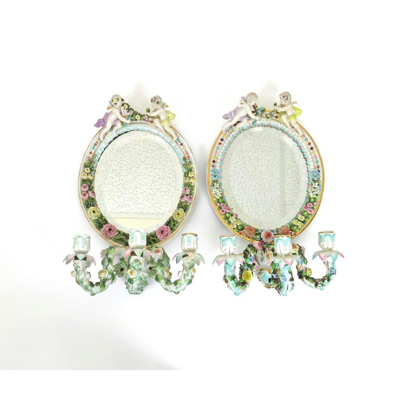 A matched pair of Dresden porcelain mirrored wall sconces late 19th/early 20th century