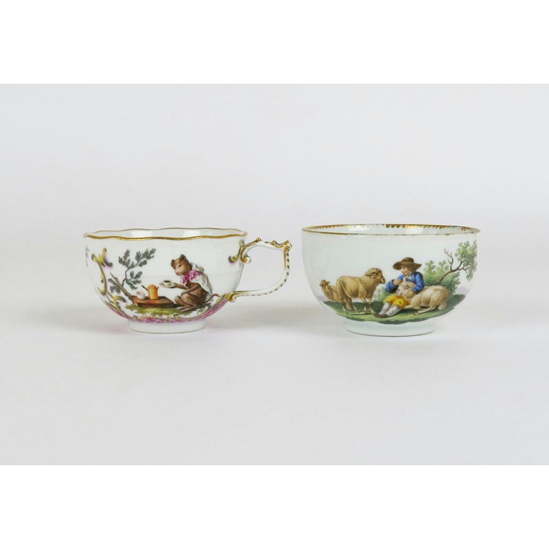 A Meissen animalier decorated tea cup 19th century, painted with a monkey drinking a cup of chocolate beside a low table, with further panels of flowers and birds, and a Meissen tea cup painted with a shepherd and three of his flock, blue crossed swords mark, the latter Marcolini, 10cm max. (2)