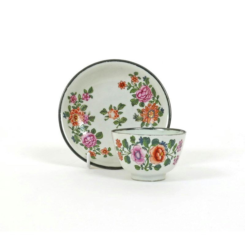 A Du Paquier teabowl and saucer c.1730, brightly decorated with flower sprays in pink, red, blue and green enamels, highlighted with gilt, within black line rims, the underside of the saucer with three iron red flower stalks, 11.5cm. (2)