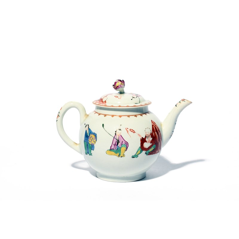 A Worcester teapot and cover, c.1760, painted with the Pu Tai or Corpulent Monk pattern, with three Chinese figures seated with varying attributes, the rim and shoulder with a gilt spearhead border, a crack to the spout, 19.2cm across. (2)