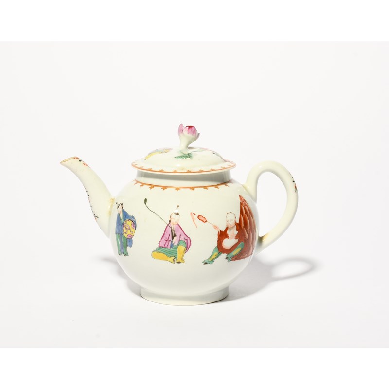 This pattern was copied directly from Chinese porcelain and was in use roughly between 1757 and 1766. Pu Tai was a Buddhist monk who lived during the Tang dynasty.