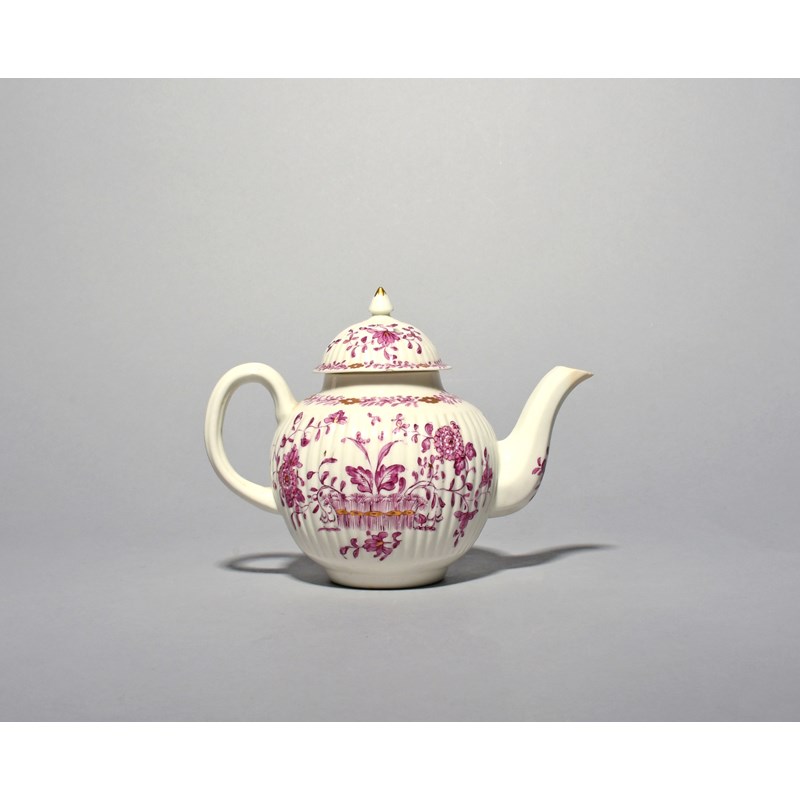 A Derby reeded teapot and cover c.1760, moulded with a wide band of ribbing and painted in purple camaieu with flowering Oriental branches and a banded hedge, the shoulder with a band of gilt flowerheads and purple foliage, 18.5cm across. (2)