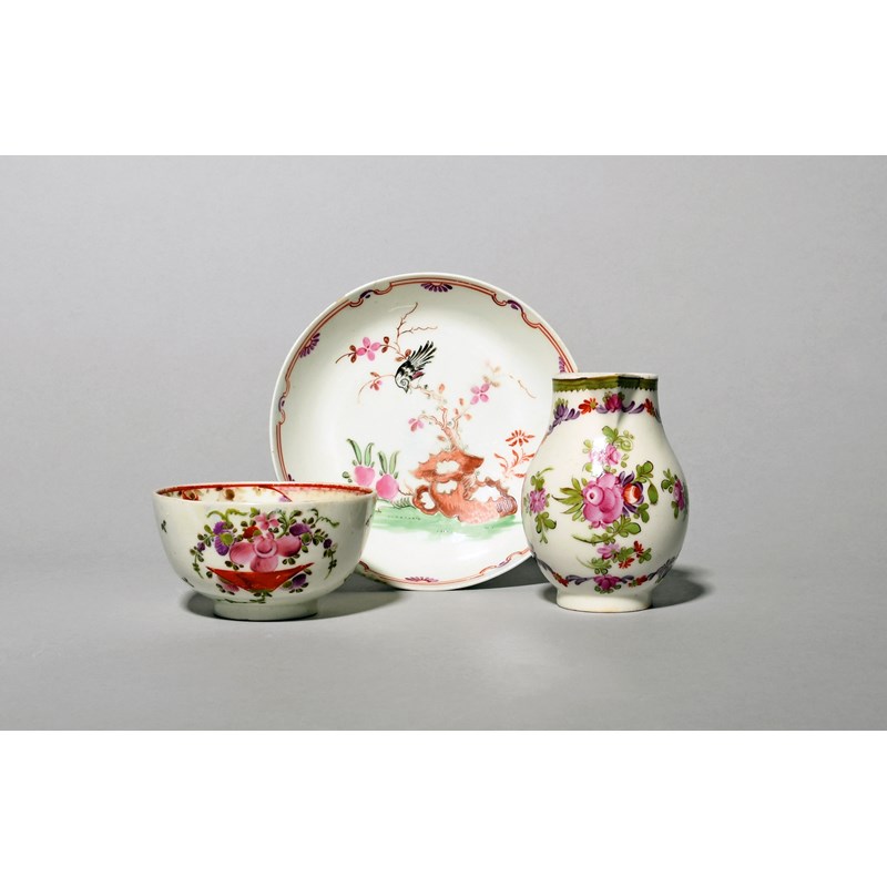 A Lowestoft saucer, c.1770, painted in polychrome enamels with the Blackbird pattern, a Lowestoft milk jug painted with stylized flower sprays within a polychrome floral border, and a teabowl painted with a simple flower basket, the interior rim with a wide scrolled border, 12.8cm max. (3)