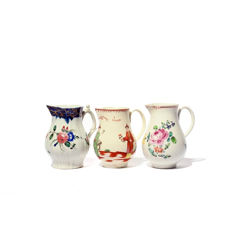 Three Liverpool milk jugs, c.1765-75, two Philip Christian and variously decorated with flowers, one fluted with a blue and gilt cracked ice border, the last Pennington's and painted with two Chinese figures in a garden, 9.8cm max. (3)