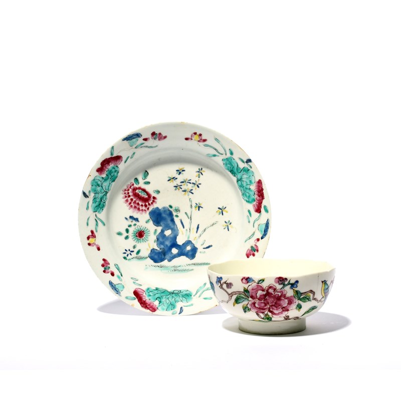 A Bow small bowl and a plate, c.1754-58, the bowl with a lobed rim and brightly painted in famille rose enamels with a bird perched on flowering branches, the plate with bamboo and chrysanthemum issuing from holey rockwork, the rim with sprays of lotus, minor damages, 19.7cm max. (2)