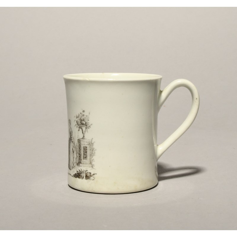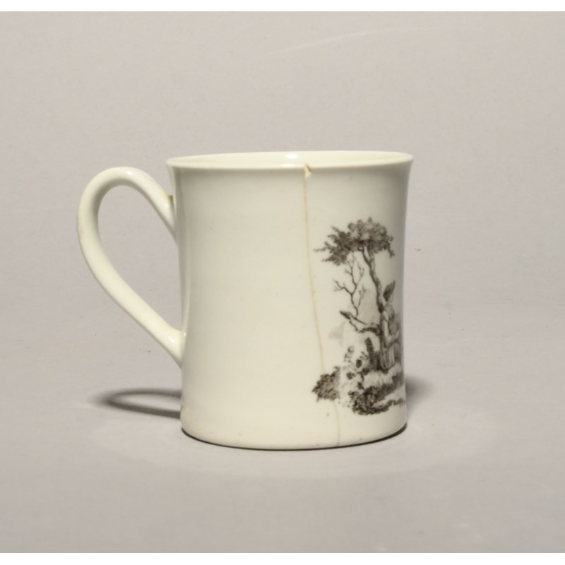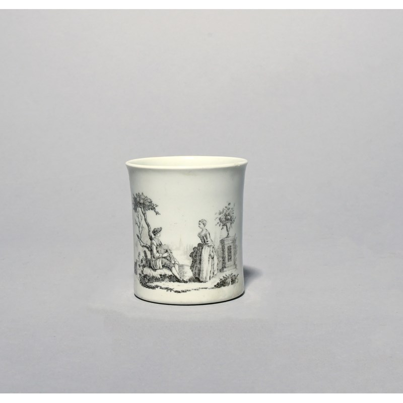 An early Worcester small mug or coffee can c.1754, printed in black with the 'Piper' pattern, a musician seated beneath a tree with a set of bagpipes, regarded by a lady standing before statuary, a long rim crack, 6cm.