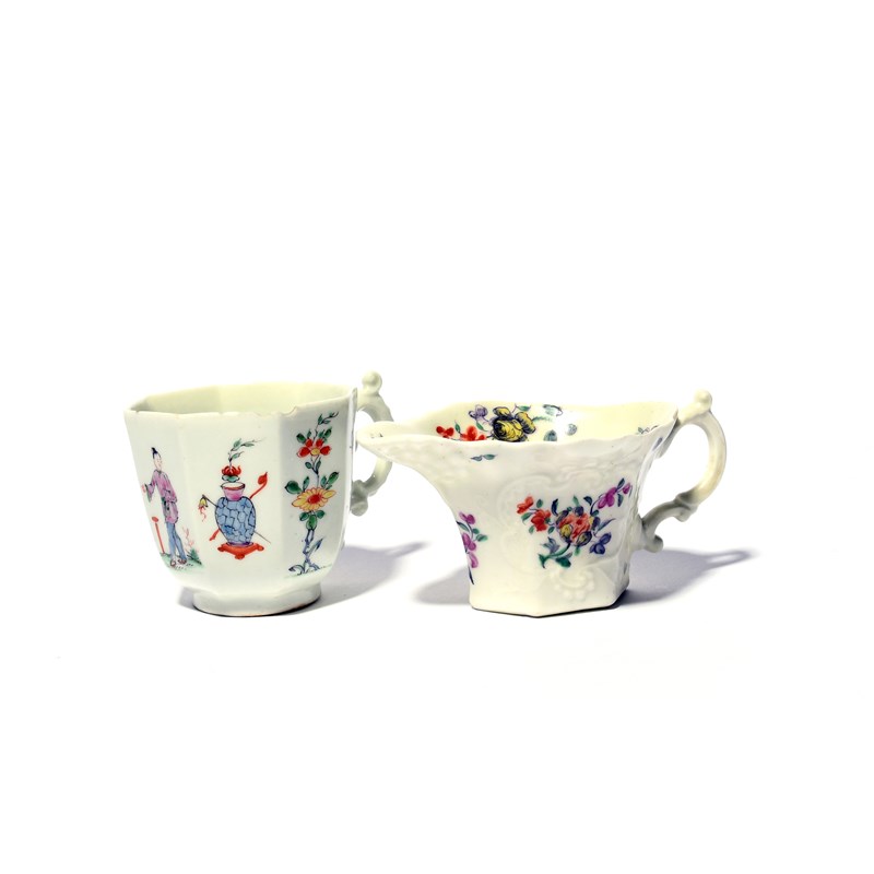 An early Worcester octagonal cup, c.1753-55, painted with a Chinese figure flanked by vases and flower sprigs, with an elaborate scroll handle, and a Worcester creamer moulded with panels and painted with polychrome flower sprays, some chipping to the cup, some restoration to the creamer, 10.8cm max. (2)