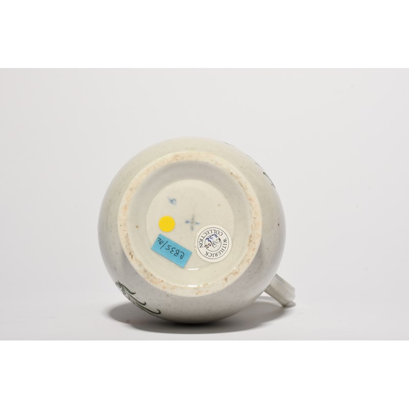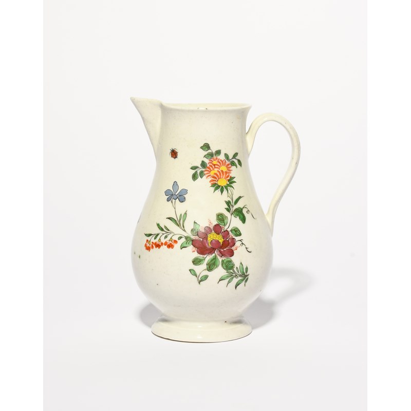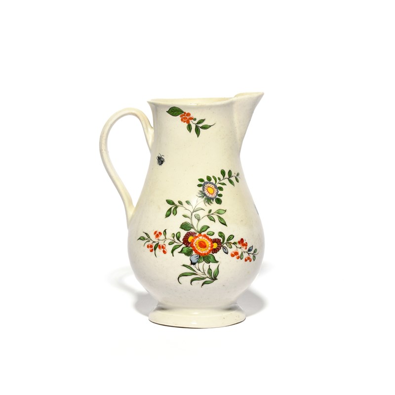 A Bristol jug, c.1775, painted in the Oriental manner with stems of flowering plants, with scattered insects around, blue X and 9 mark, some restoration, 17cm.