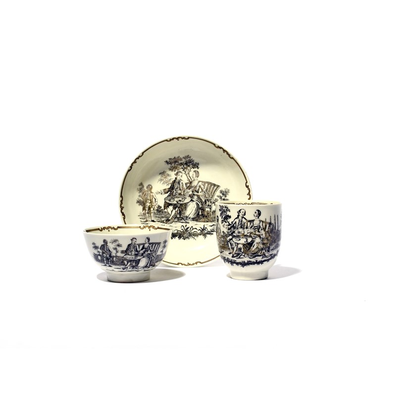 A Pennington's (Liverpool) trio, c.1765-70, comprising a coffee cup, teabowl and saucer, printed in black with the Tea Drinkers pattern, a couple seated on a garden bench with an attendant standing nearby, with a black and gilt painted rim, 12.1cm. (3)