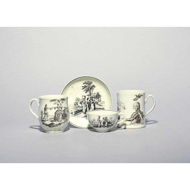 Two small Worcester mugs, c.1757-60, one printed in black with the King of Prussia beside victory motifs, the other bell-shaped and printed with The Minuet and The Haymakers, and a Worcester teacup and saucer printed with The Milkmaids, 13.1cm max. (4)
