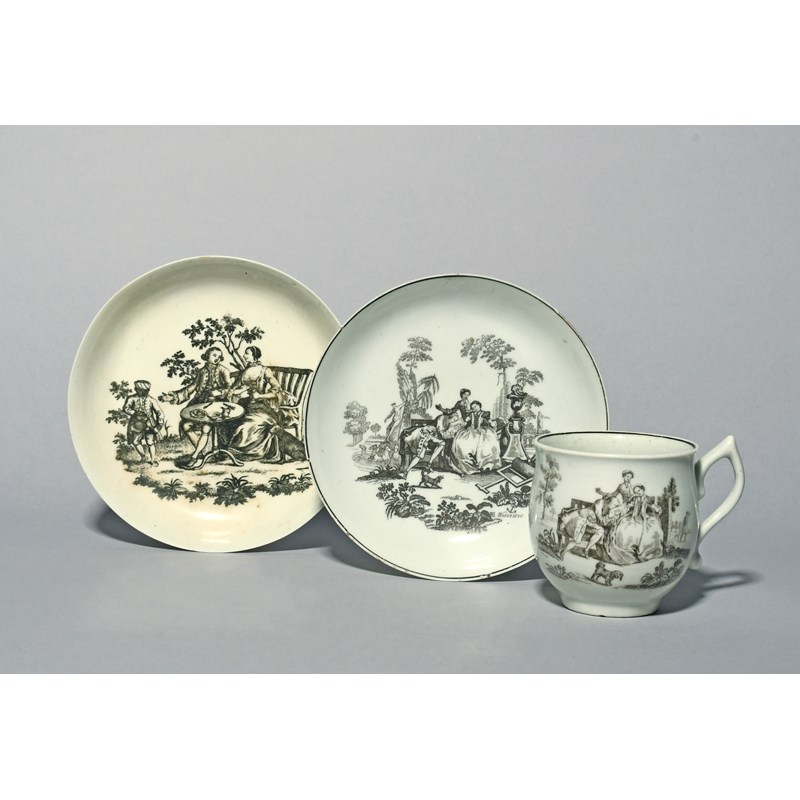 A Worcester cup and saucer, c.1755, printed in black with L'Amour, depicting a couple courting in a garden setting, the saucer signed in the print with RH for Robert Hancock and with an anchor rebus for Richard Holdship, and a Worcester saucer printed in black by John Sadler of Liverpool with the Tea Drinkers, 11.7cm max. (3)