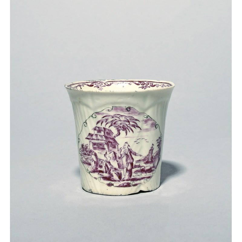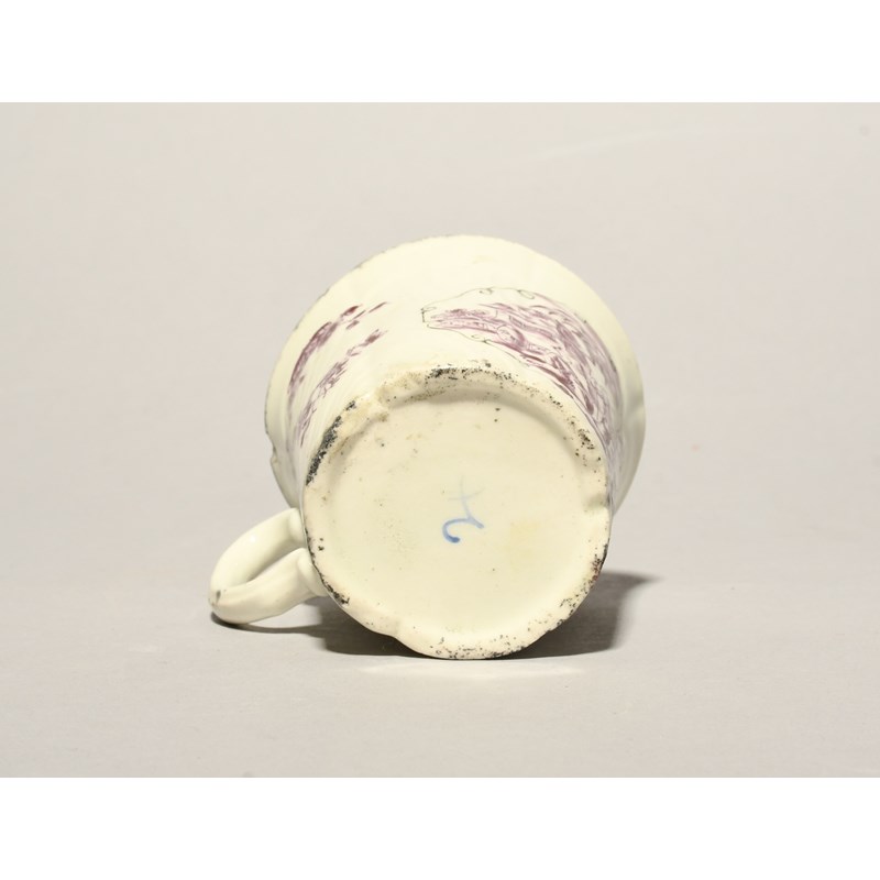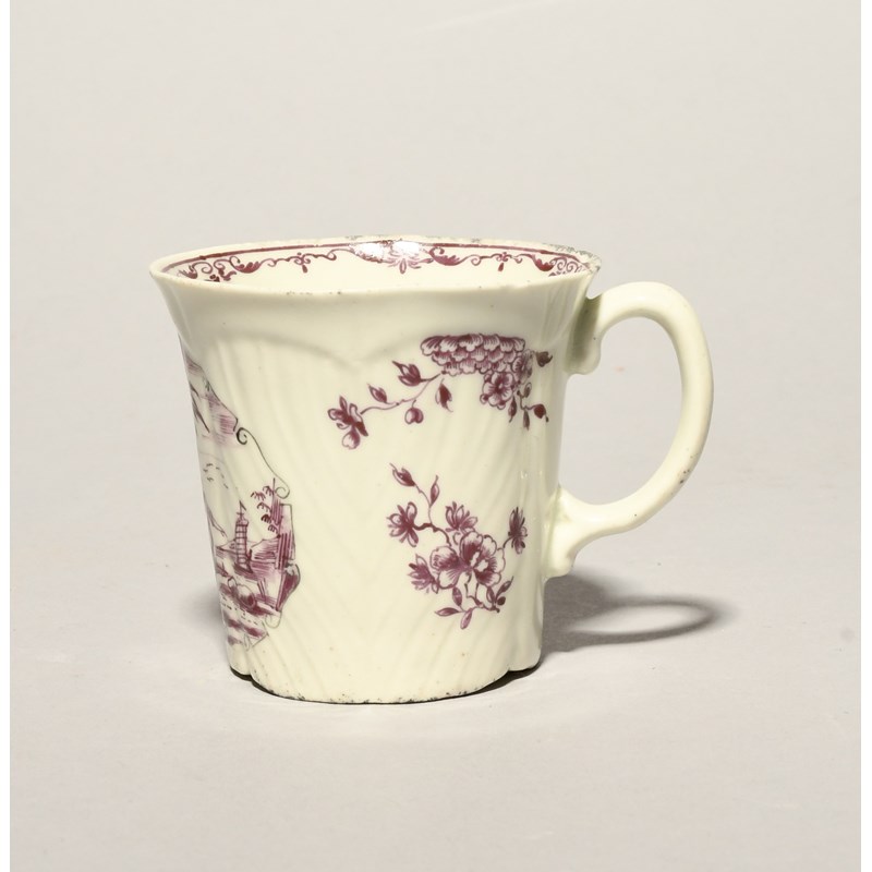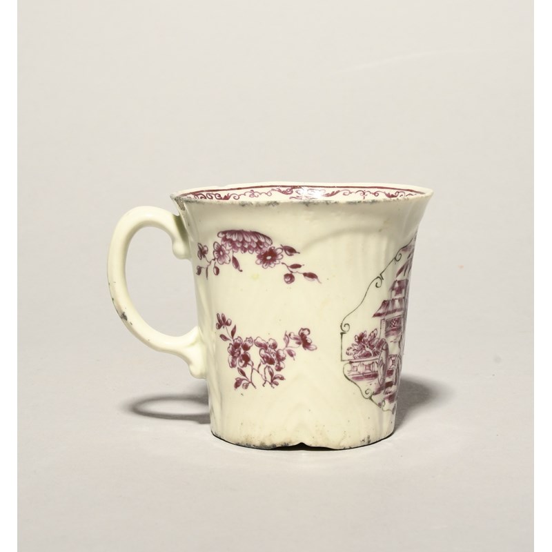 A Worcester feather-moulded coffee cup, c.1758, finely pencilled in puce at a later date with a cartouche containing a Chinese couple before a pagoda and a sailing vessel, flanked by flowering branches, the interior rim with a formal foliate border, blue tin mark to the base in imitation of Plymouth, some peppering, a small rim chip, 6.4cm.