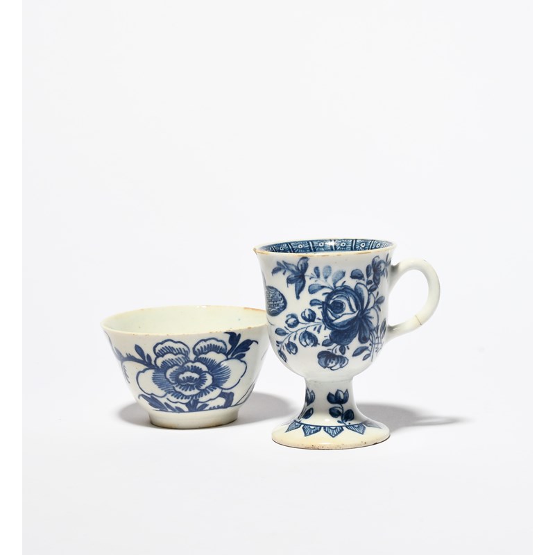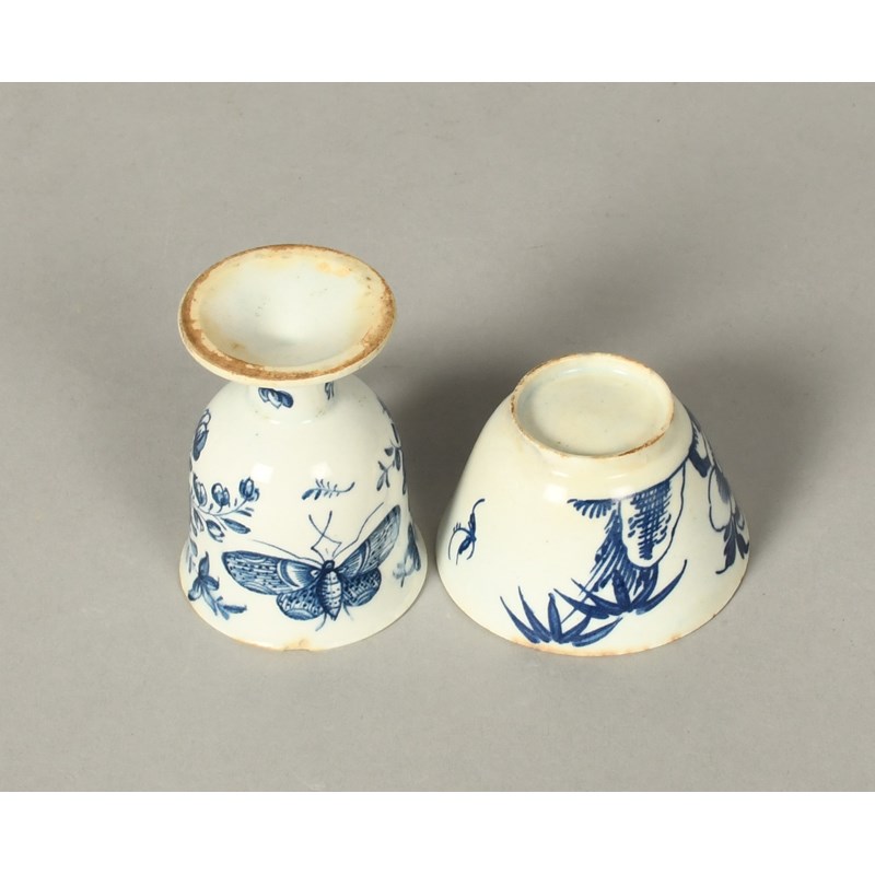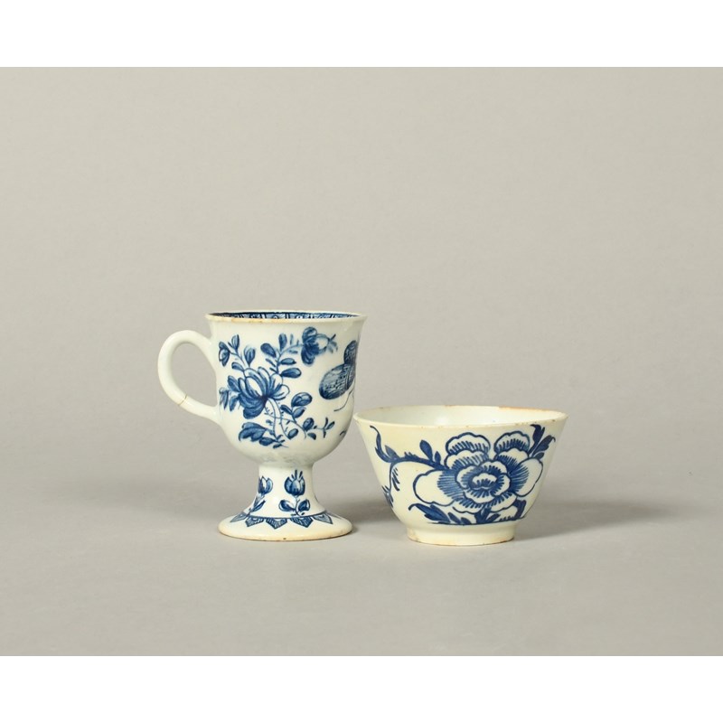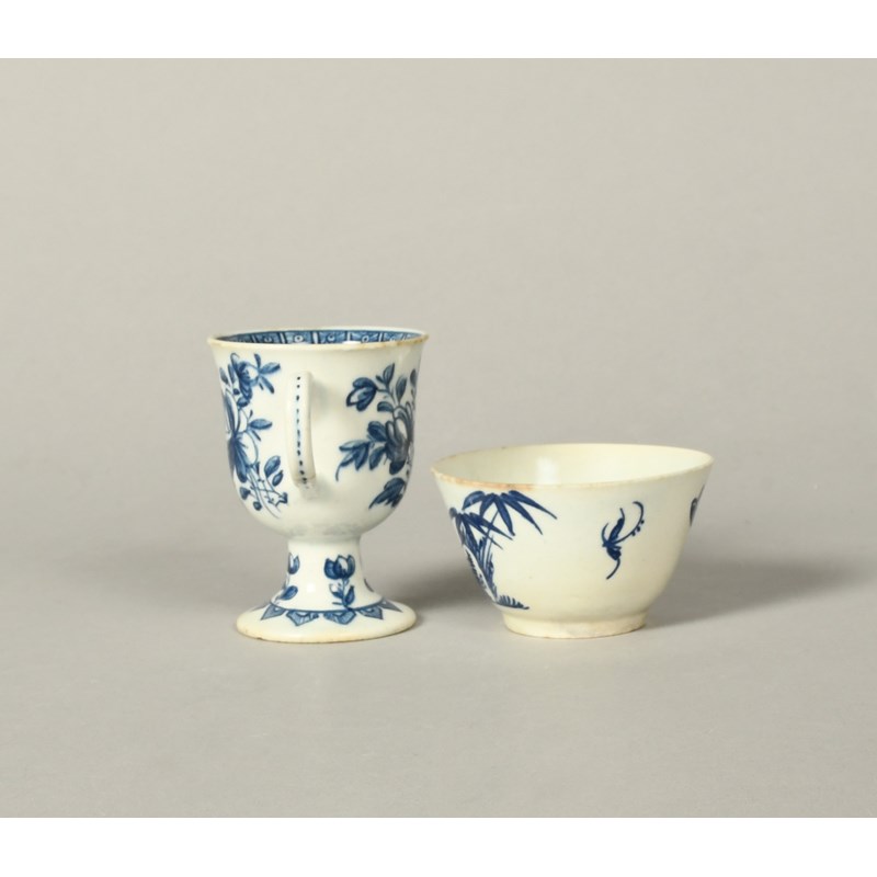 A Derby blue and white ice cup, c.1770, decorated with a large butterfly flanked by flower sprays, raised on a flared foot, and a Bow flared teabowl painted with peony and bamboo, the cup's handle cracked, a rim chip, 7.2cm max. (2)