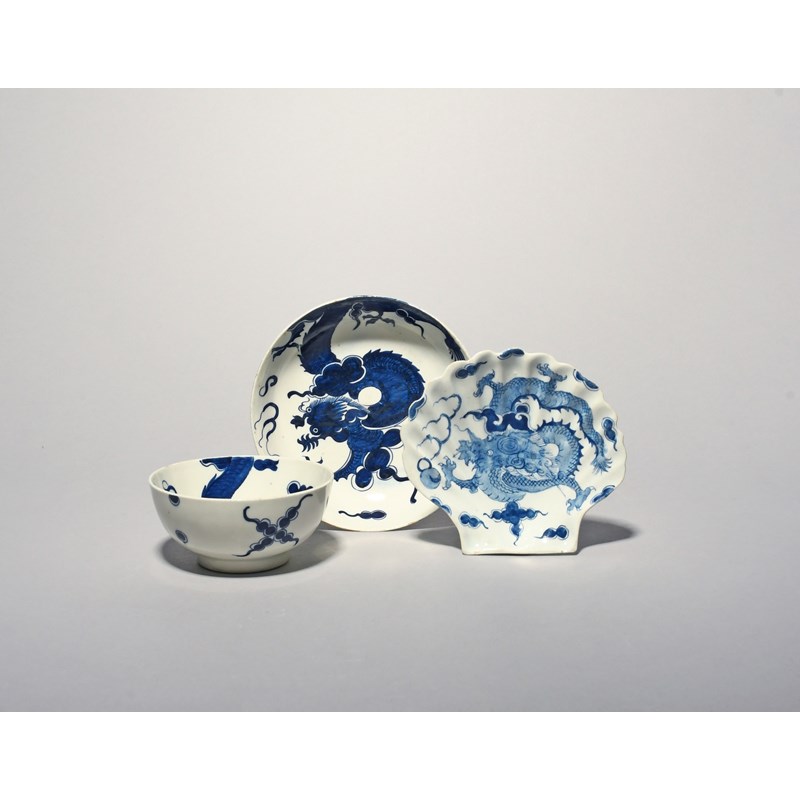 A Bow blue and white pickle dish or salt, c.1755-58, of shell shape, painted with the Dragon pattern, raised on two peg feet, numeral 14 mark, and a large Lowestoft breakfast teabowl and saucer painted with the Dragon pattern, 14.7cm max. (3)