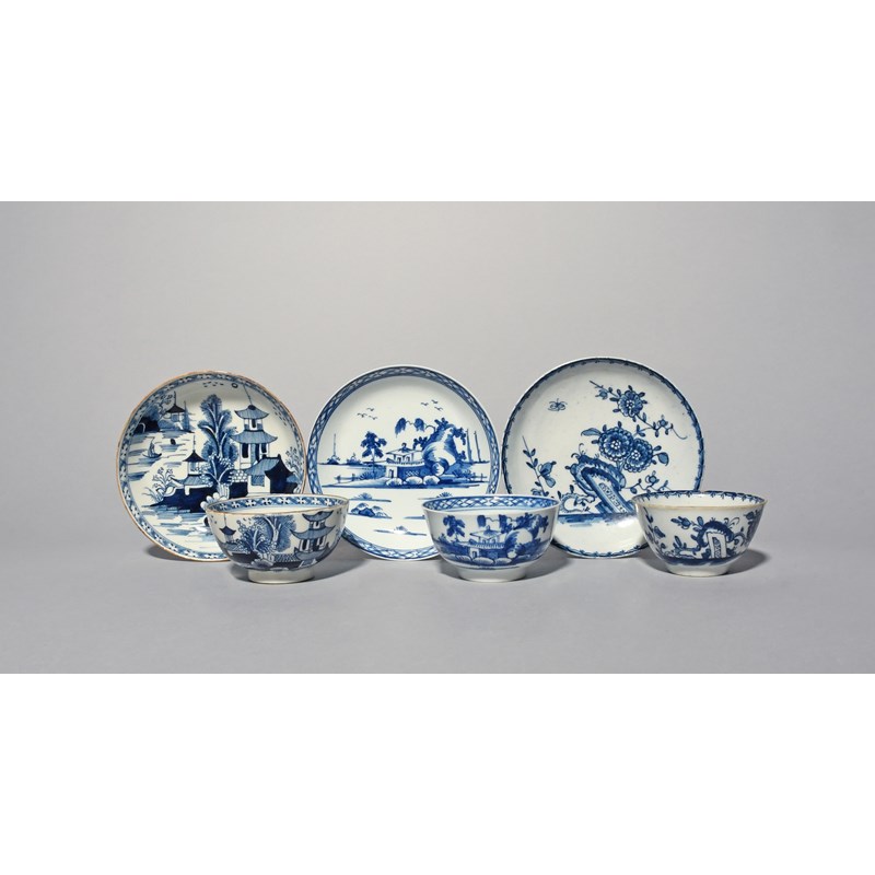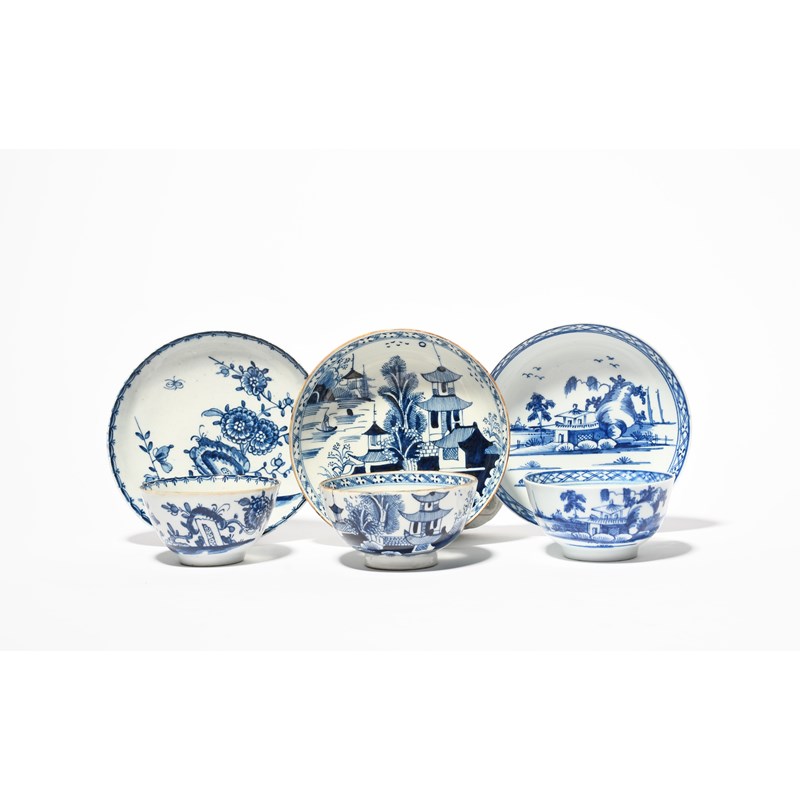 Three Lowestoft blue and white teabowls and saucers, c.1765-75, one painted with flowering branches and rockwork within a berry border, painter's mark to the footrim, the other two with differing pagoda landscapes within a trellis border, 11.8cm max. (6)