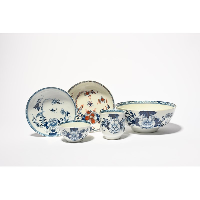 A Liverpool blue and white trio, c.1760, comprising a coffee cup, teabowl and saucer, painted with a bird perched on a flowering peony branch, a slop bowl in the same pattern, and a similar saucer with red and gilt highlighting, 15.8cm max. (5)