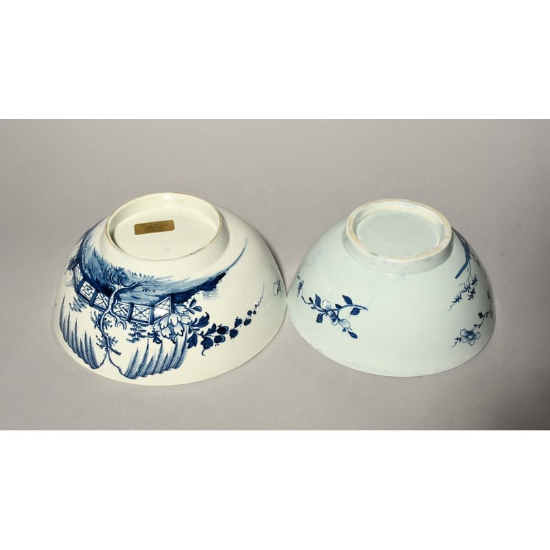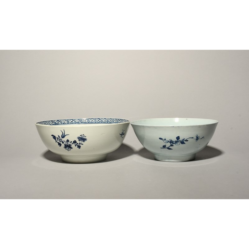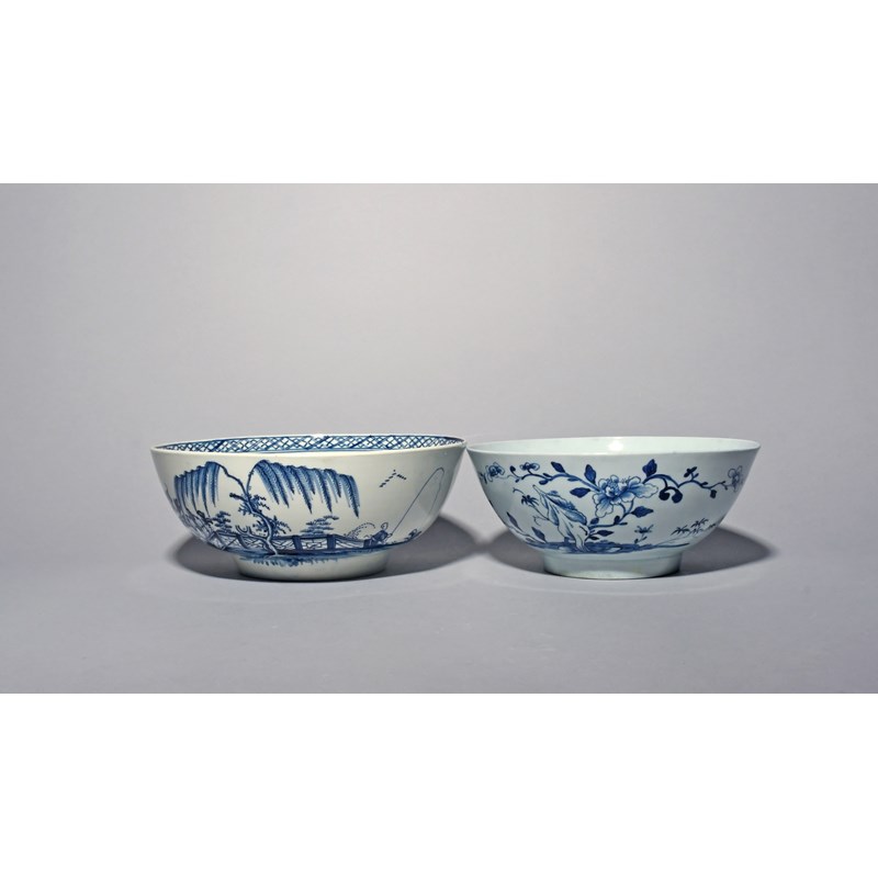 Two Liverpool blue and white punch bowls, c.1758-65, one probably William Reid and painted with stylized rockwork beside flowering peony branches, the other with a Chinese figure fishing beside an ornamental fence and beneath a tall fringed tree, the interior with a bird perched on a low fence, 24.4cm max. (2)