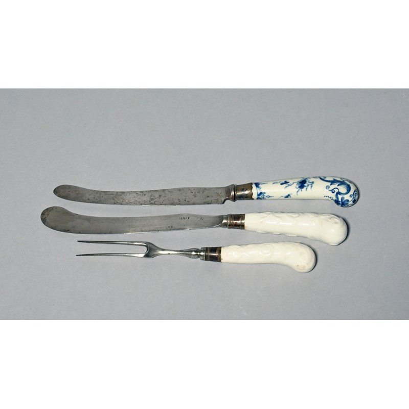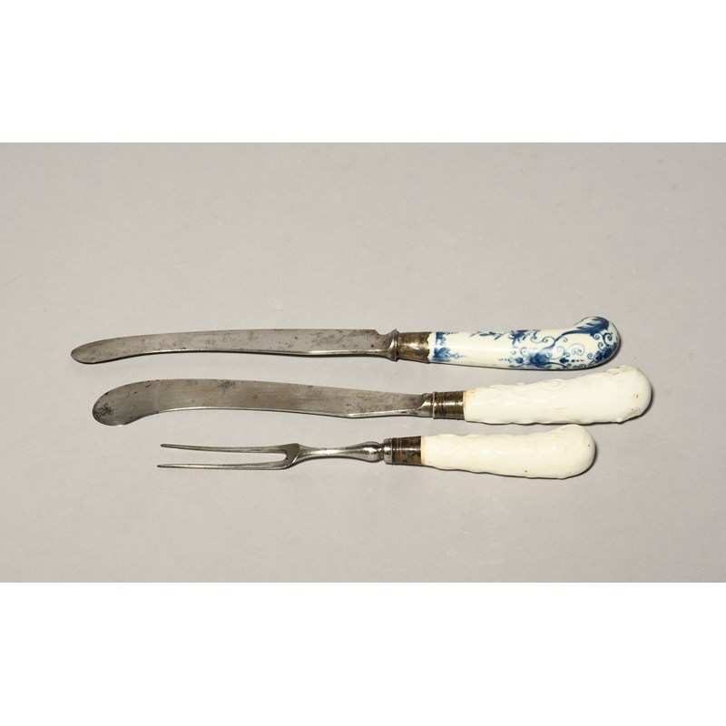 A knife and fork with Bow porcelain handles, c.1758-60, the hafts of pistol grip form, moulded with formal scroll designs, and a Worcester knife with a blue and white handle painted with formal foliate scrolls and flowering branches, 28.5cm max. (3)