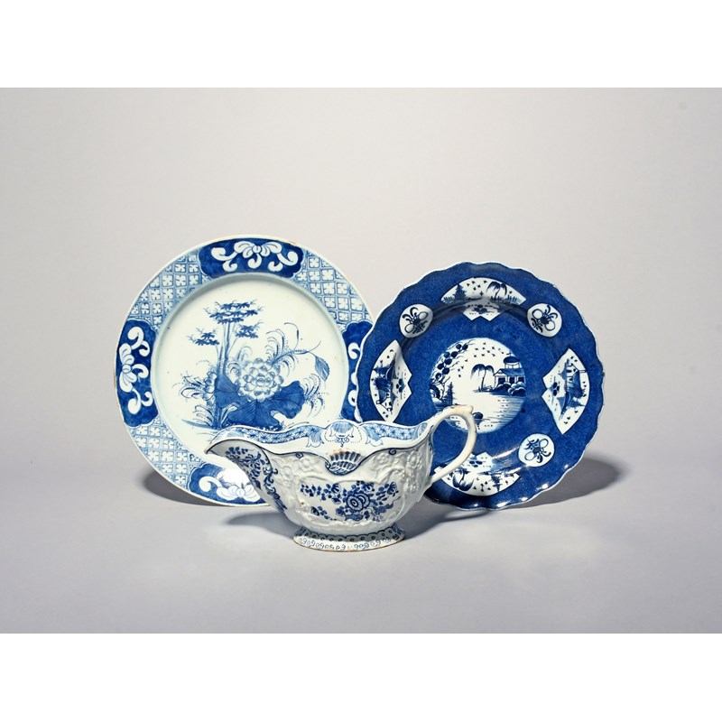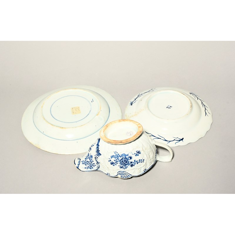 Two Bow blue and white plates c.1758-62, the larger painted with bamboo and chrysanthemum, number 16 mark, the other with a fan-panelled design on a powder blue ground, pseudo Chinese mark, and a Bow strap-moulded sauceboat painted with flower sprays within moulded floral panels, impressed T mark, 22.5cm max. (3)