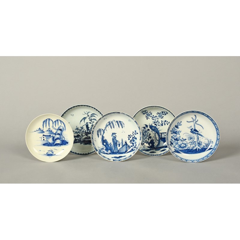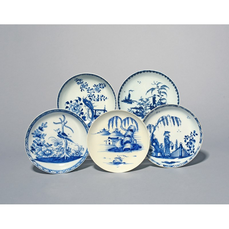 Five English blue and white saucers, c.1755-65, one Vauxhall and painted with a low hut beneath a willow tree and towering rocks, two Lowestoft , one painted with a Man on a Bridge within a berry border, another with flowering branches, and two Bow, one with a Chinese man beneath willow, the other with a bird on a bare tree, 12.3cm max. (5)