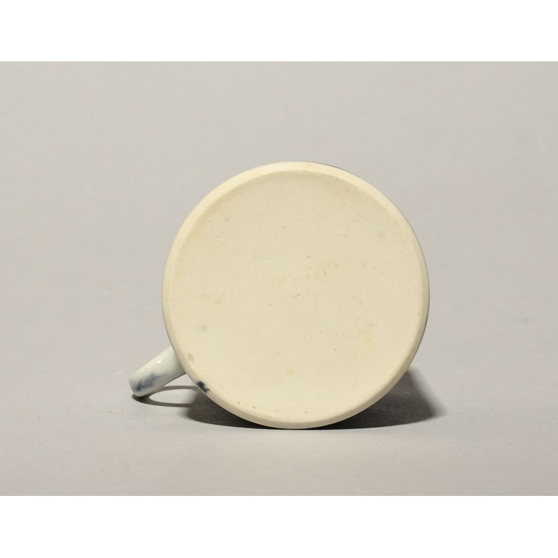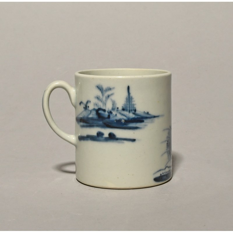 A William Reid (Liverpool) blue and white coffee can or small mug, c.1756-60, the cylindrical form painted with the Fir Tree and Rock pattern, a gnarled pine above rockwork, the reverse with round rocks before an island, painter's mark to the foot, 6.5cm.