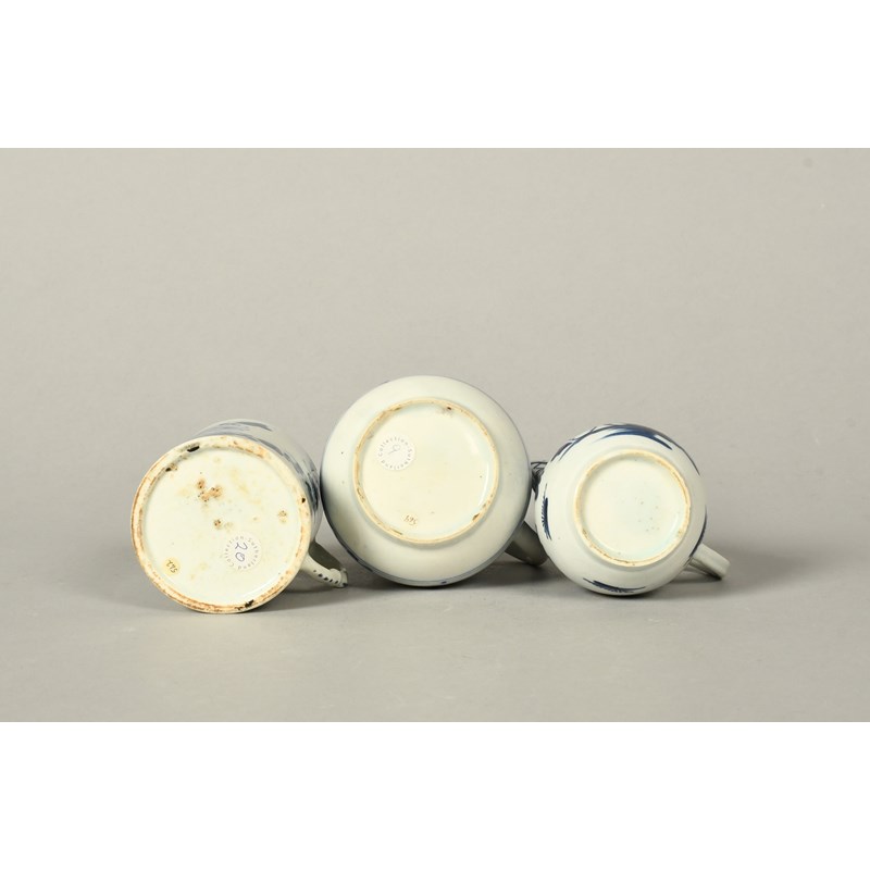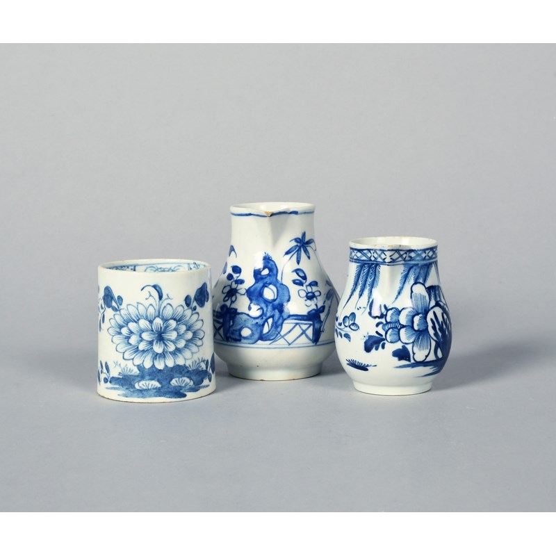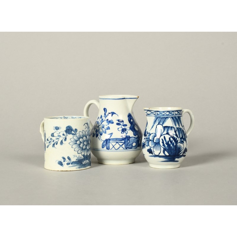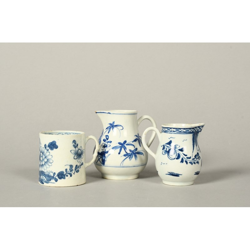 A rare Bow blue and white coffee can or small mug, c.1755, with an unusual moulded scroll handle, the cylindrical body painted with a large chrysanthemum spray, and two Bow sparrowbeak jugs, painted with peony, willow, bamboo and chrysanthemum, minor faults, 8.7cm max. (3)