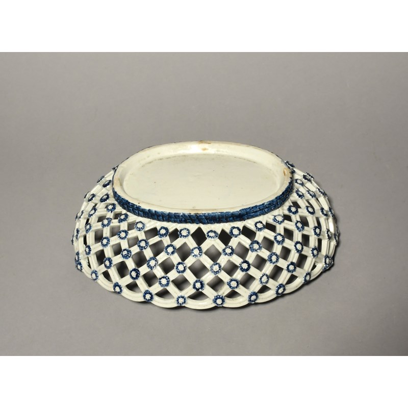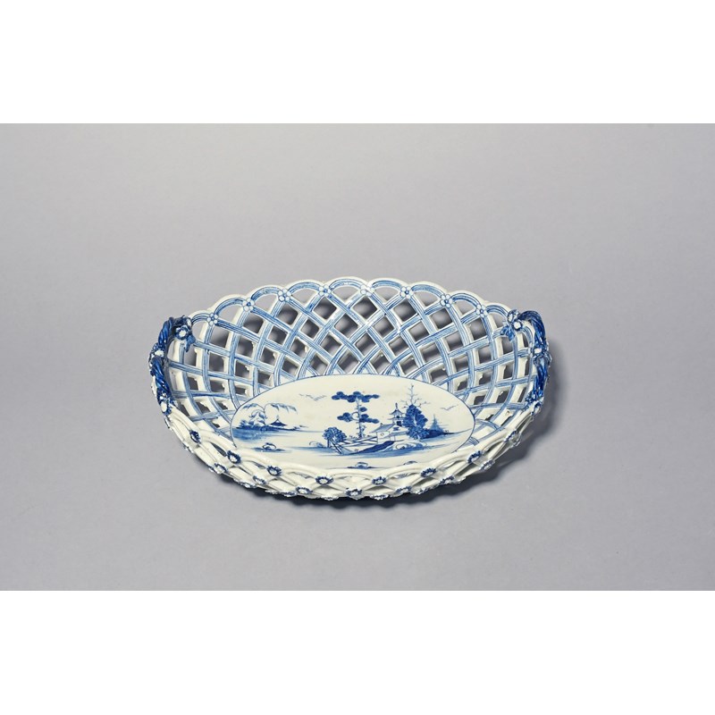 A good Derby two-handled blue and white basket, c.1760, the oval form painted to the well with a pagoda beneath a tall pine tree and other plants in an island landscape, the pierced sides finely decorated with parallel lines and flowerheads, the exterior applied with flower heads at the intersections, 27.2cm across.
