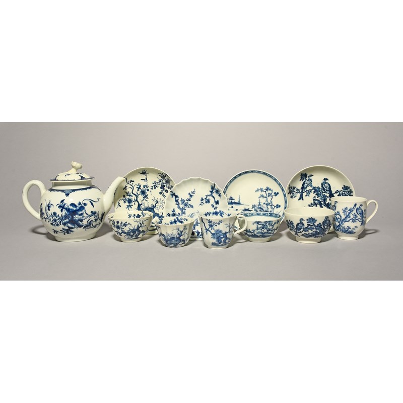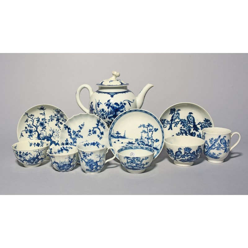 A group of Worcester blue and white teawares, c.1758-70, including a teapot and cover painted with the Mansfield pattern, a fluted trio and a teabowl and saucer in the Prunus Root pattern, and a teabowl and saucer in the Cannonball pattern, together with a Caughley trio in the Birds in Branches pattern, 18.5cm max. (12)