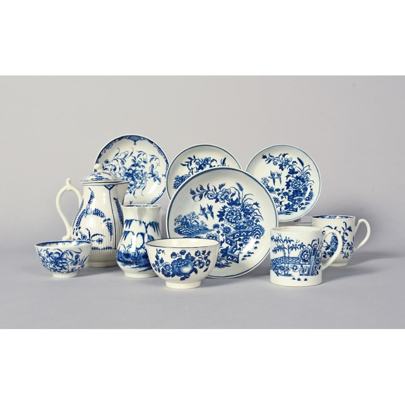 A small collection of Worcester blue and white teawares, c.1760-80, including a Mansfield pattern teabowl and saucer, three Fence pattern saucers, a coffee cup in the Leaf Scroll border pattern, a jug and cover in the Immortelle pattern, a teabowl printed with fruit sprays, a coffee can in the Plantation pattern, and a milk jug in the Candle Fence pattern, hatched and open crescent marks, 13cm max. (11)