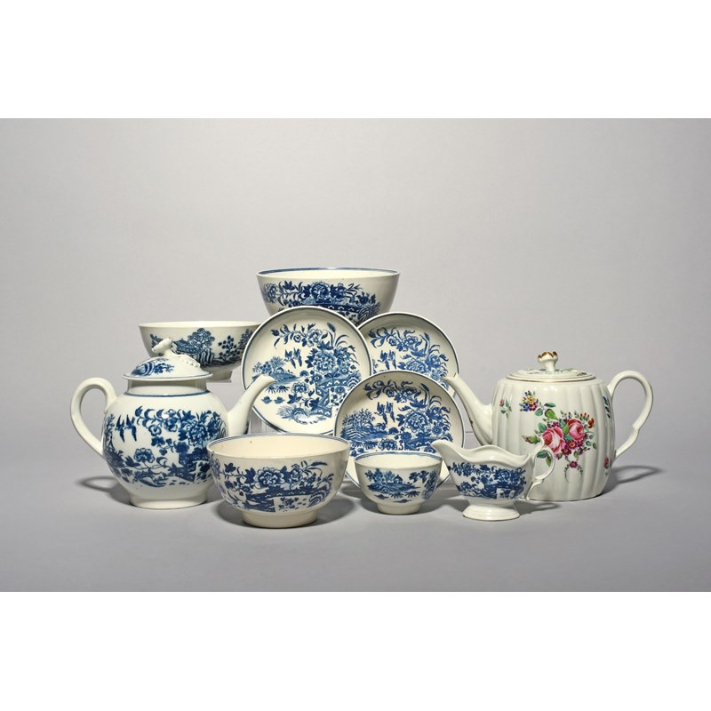 A collection of English blue and white porcelain, c.1760-80, including a Caughley teapot and cover in the Fence pattern, three Worcester and Caughley bowls in the Fence and other patterns, three Worcester saucers and a teabowl in the Fence pattern, a Caughley creamboat with the same decoration, and a Worcester polychrome teapot and cover with floral decoration, minor faults, 19.6cm max. (12)