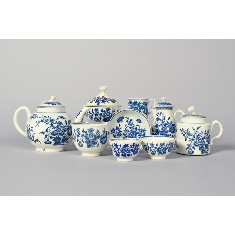 A collection of Worcester blue and white tea wares, c.1760-80, all printed in the Three Flowers pattern, including a teapot and cover, a sucrier and associated cover, a jug and cover, a preserve pot and cover, a small bowl, a teabowl and saucer, a coffee can and a Caughley teabowl in the same pattern, some faults, 19cm max. (13)