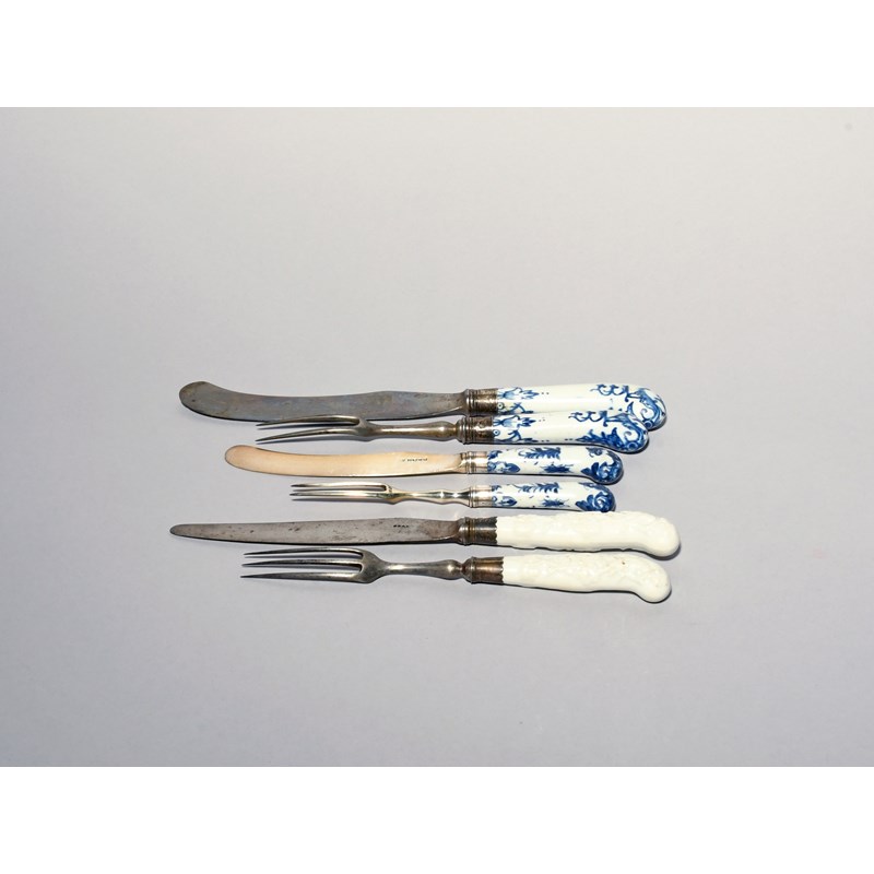 Two Chelsea knife and fork handles, c.1752, of pistol shape and sprigged with flowering prunus, a Bow knife and fork with blue and white handles, and a smaller Worcester knife and fork with handles painted in underglaze blue with the Knife Handle Formal Floral pattern, 28cm max. (6)