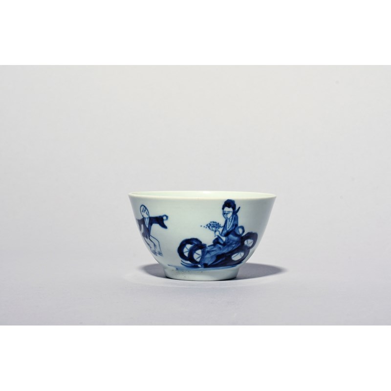 A Richard Chaffers (Liverpool) blue and white teabowl, c.1758-60, painted with the Jumping Boy pattern of an exuberant youngster beside a seated maiden, 7.5cm dia.