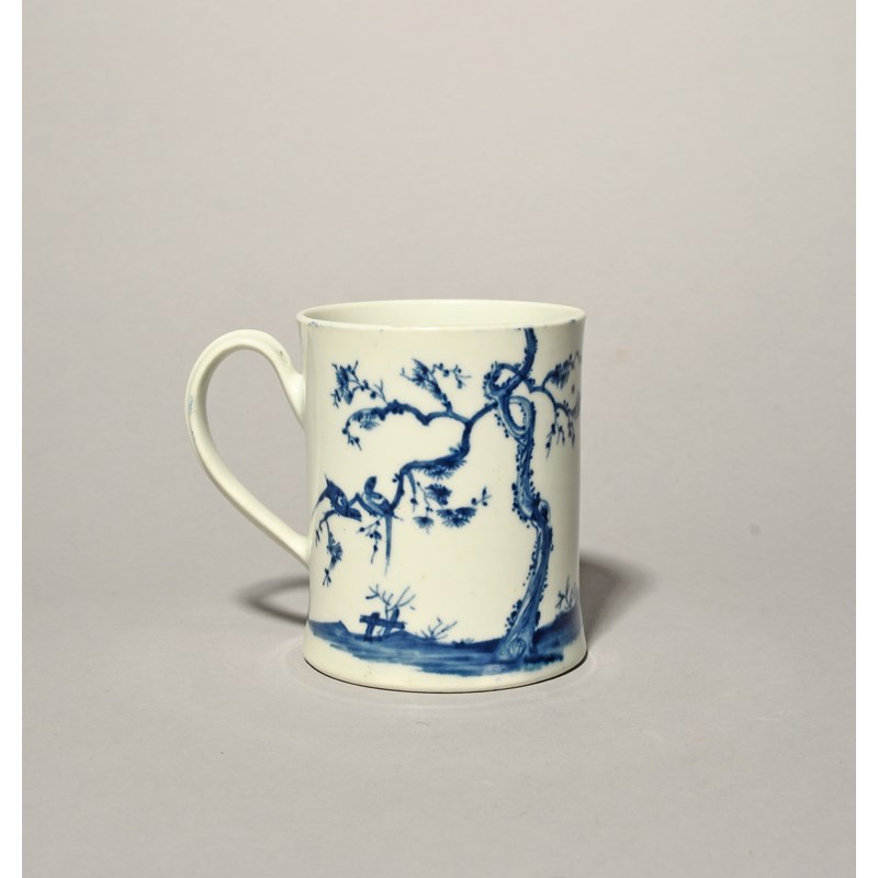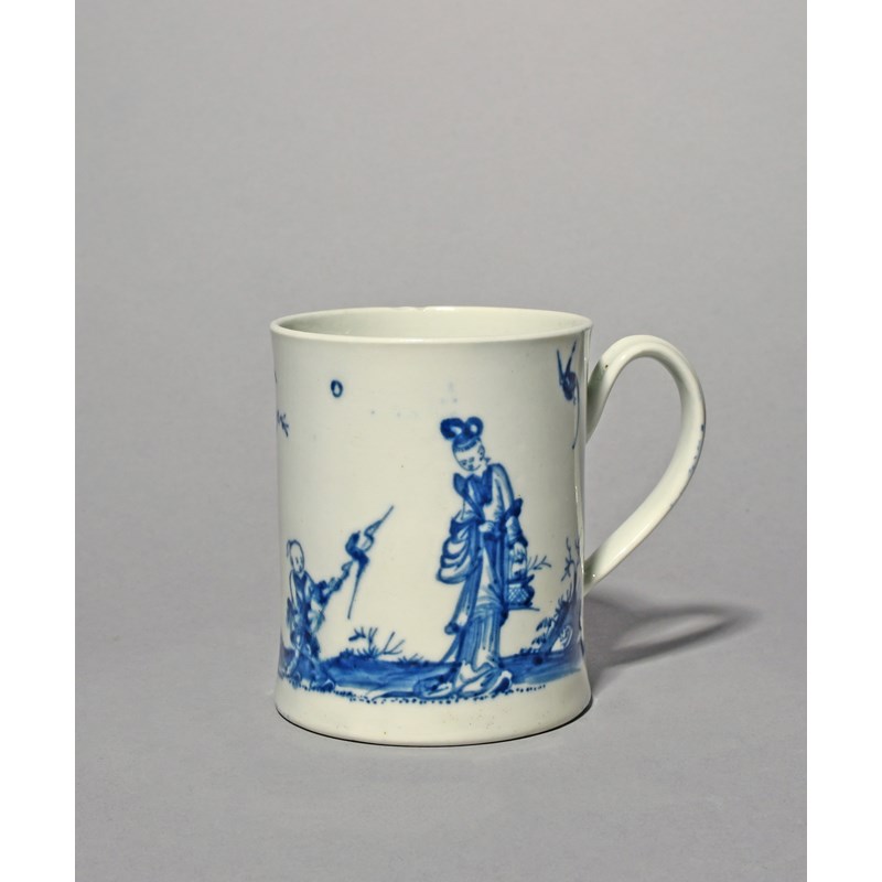 A Worcester blue and white mug, c.1755-58, the slightly waisted form painted with the Walk in the Garden pattern, a Chinese boy holding out a bird on a stick to an attendant maiden, the reverse with birds perched in a tree, workman's mark, 8.2cm.