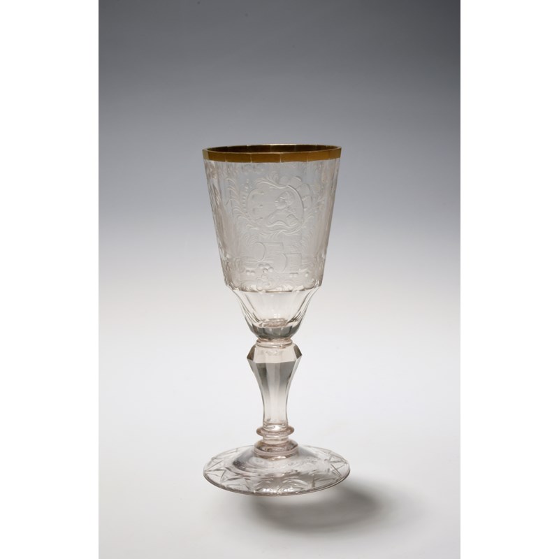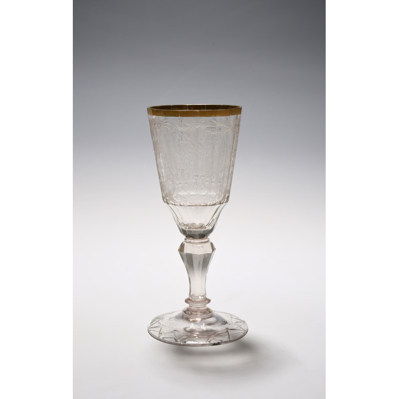 A Prussian engraved wine glass, c.1740, the faceted bowl engraved with a portrait of a Hohenzollern king, probably Frederick Wilhelm I, on a shield above military motifs, the reverse with an inscription in German referring to the Prussian army of 80,000 men, raised on a faceted stem and cut foot, 17.2cm.