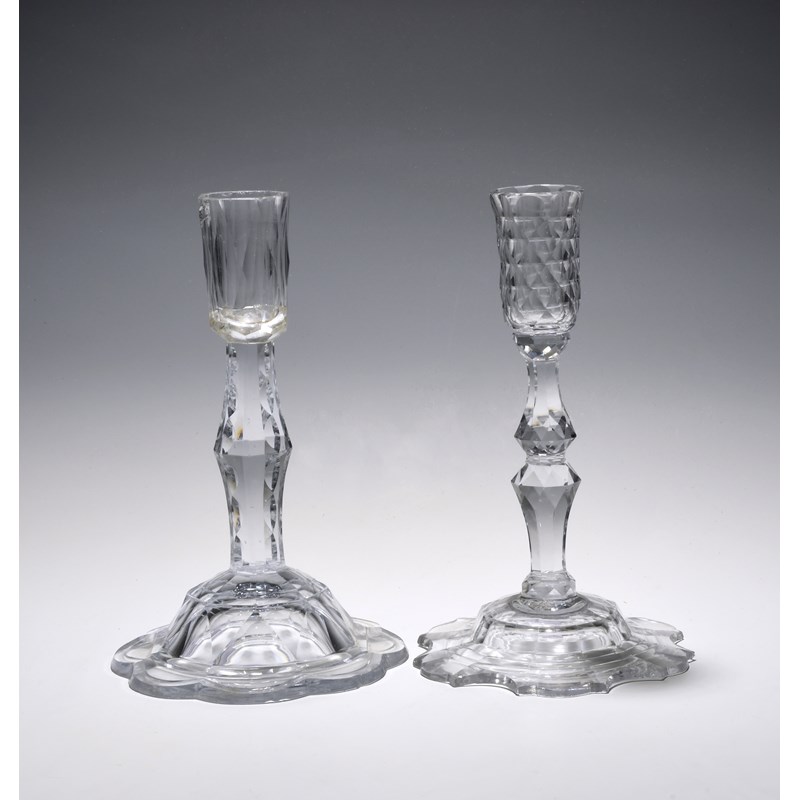 Two cut glass candlesticks, late 18th/early 19th century, with faceted cylindrical nozzles raised on knopped stems over domed cut feet, some chipping, 21.5cm max. (2)