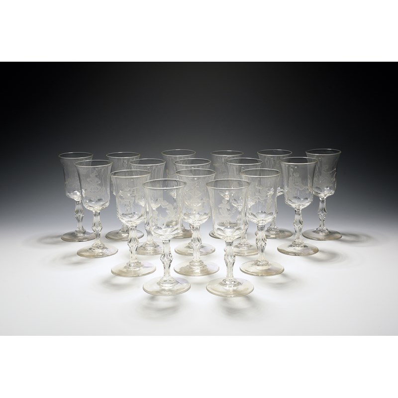 A part suite of sixteen wine glasses, 20th century, the tall bowls engraved with various figures from a monkey band, seated or standing on scroll motifs, raised on swollen faceted stems, 14.8cm. (16)