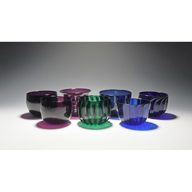 Seven coloured glass finger bowls, 1st half 19th century, three of plain U-shaped form in blue and amethyst, three with vertical moulded flutes in blue and green, the last amethyst with everted rim and applied circular band, 13cm max dia. (7)