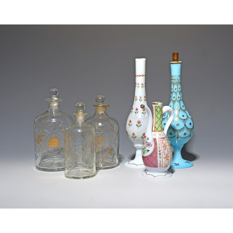 Six glass bottles for the Middle Eastern market, 19th century, three cut with trellis designs and gilt foliate motifs, one of blue opaque glass with a gilt scale design, another white opaque glass with a panelled floral design, the last a ewer with thin curved spout, four with stoppers, 26.5cm max. (10)