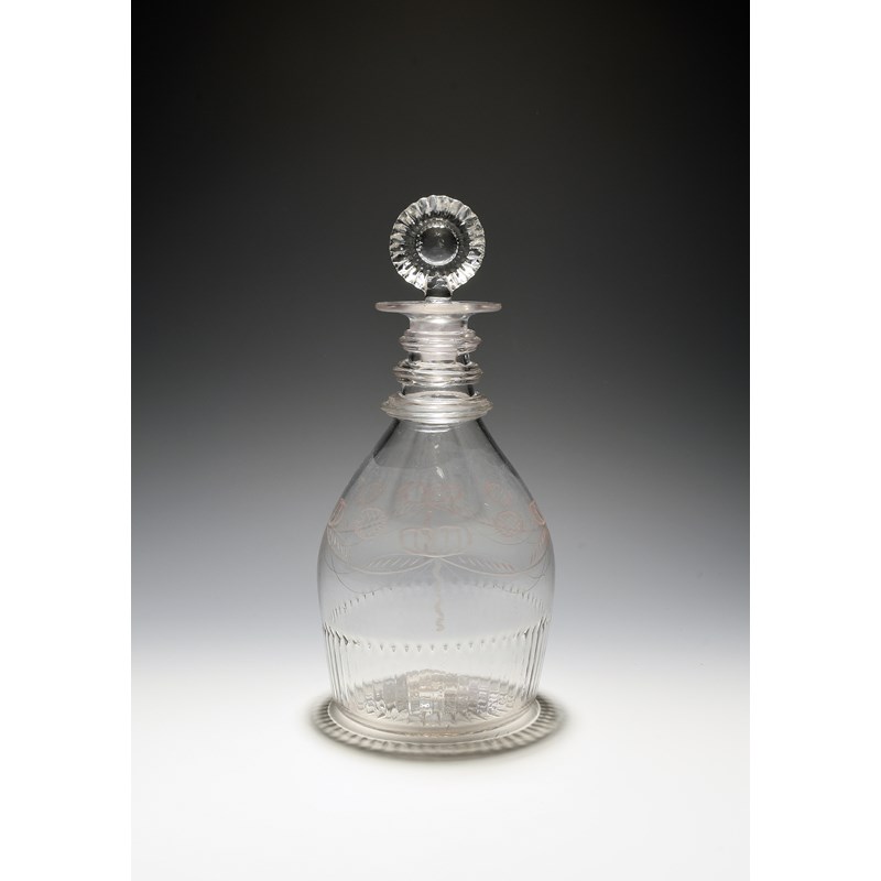 An Irish glass decanter and stopper, c.1820, Waterloo Glass Works of Cork, of Prussian shape, engraved with stylized flowers between ribbon bows above a band of vertical moulded flutes, the neck applied with three rings, with a moulded bullseye stopper, moulded mark to the base, 24.3cm. (2)