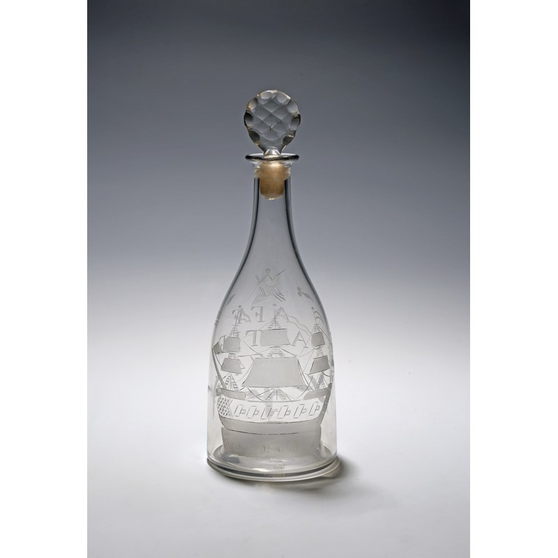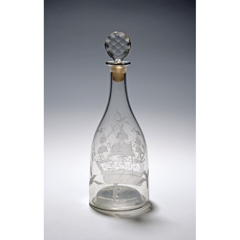 A glass decanter and stopper, dated 1774, of club shape and engraved with a three-masted ship at sail, the reverse inscribed 'A F F / CASTLE / 1774' between Masonic emblems, with a flattened honeycomb stopper, 27.7cm. (2)