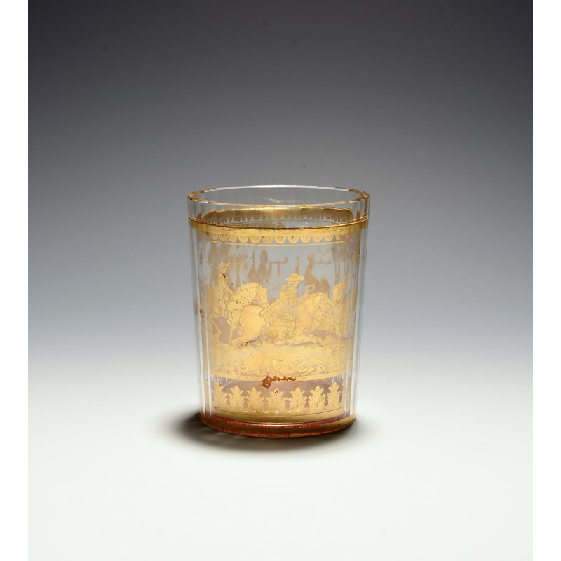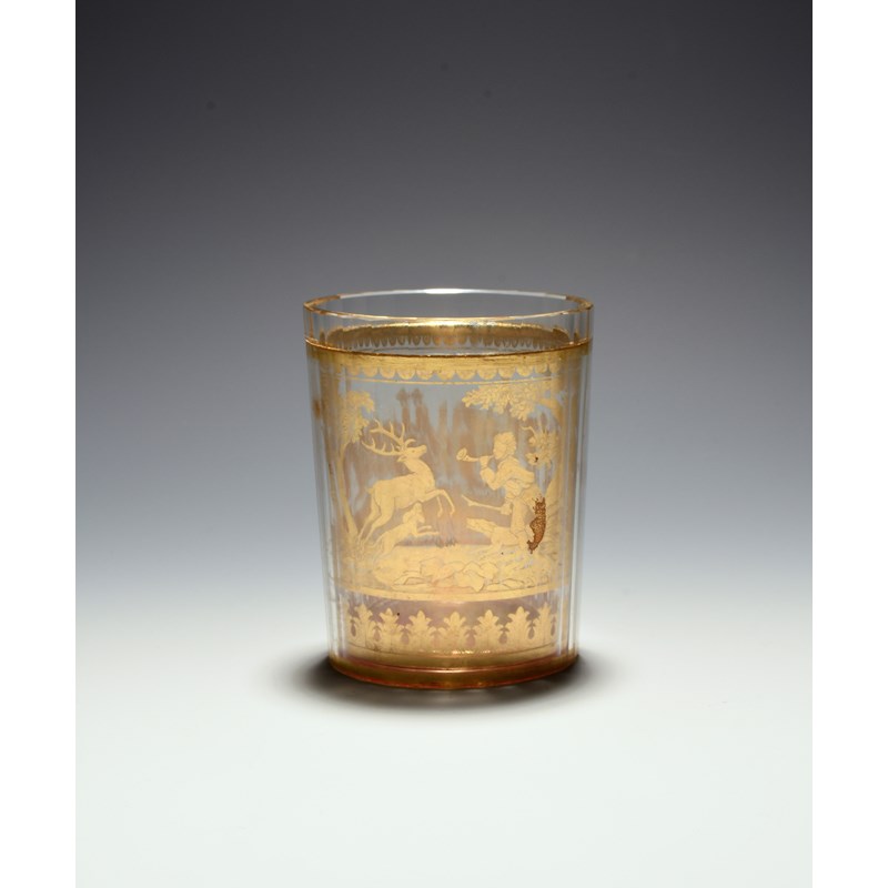 A Bohemian zwischengeldglas beaker, c.1720-30, the cylindrical fluted form gilded with a continuous stag hunt scene beneath trees, the scene echoed to a red roundel to the interior, 8.5cm.