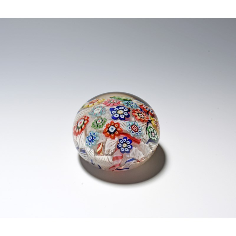 A Baccarat spaced millefiori paperweight, mid 19th century, set with sixteen stylized flower canes including animal silhouettes, set on a ground of latticino canes in white, red and blue, 6.2cm dia.