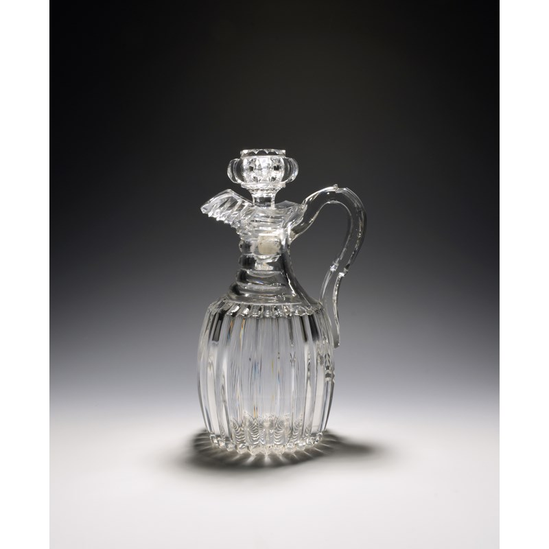 A good cut glass claret jug and stopper, c.1800, the ovoid body pillar cut, the neck with stepped rings, a little nibbling to the handle, 25cm.