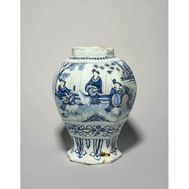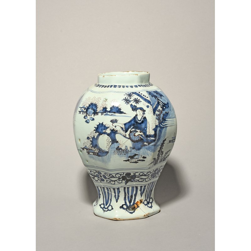 A Delft vase, c.1680, of octagonal baluster form, painted in blue and manganese with Chinese figures in garden landscapes, in the Chinese Transitional manner, a repair to the foot, the cover lacking, 20cm.