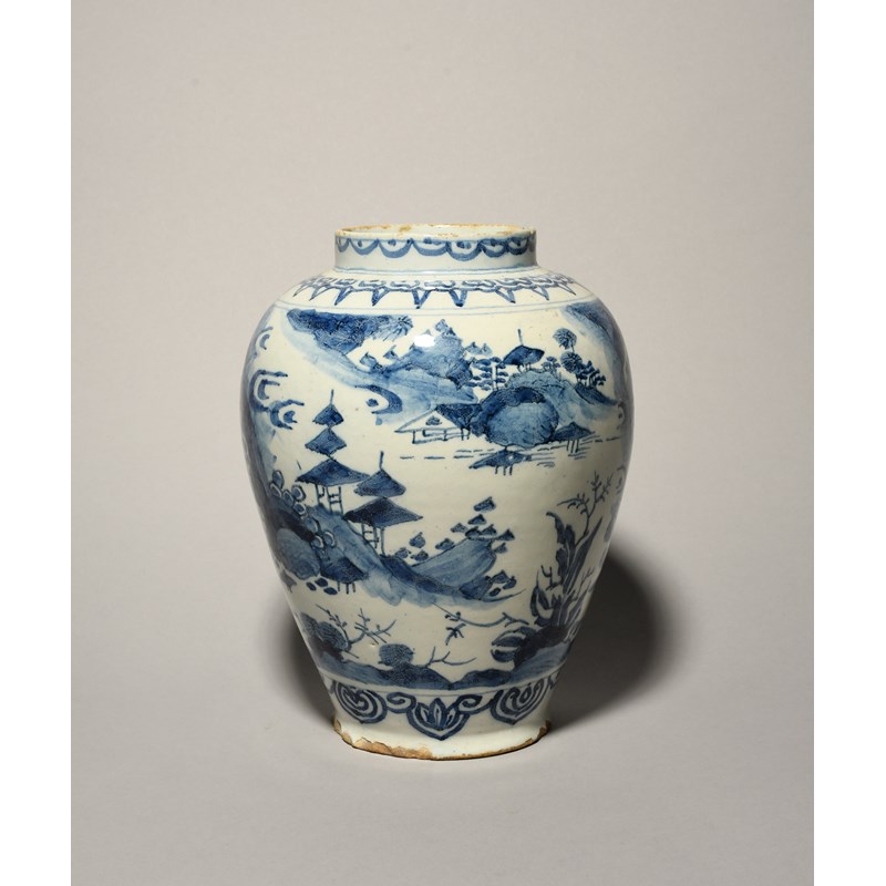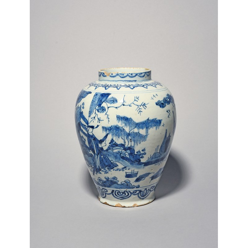 A delftware vase, 18th century, the ovoid form painted in the Chinese manner with two figures carrying vases beneath pine and willow trees, the shoulder and foot with formal bands of stiff leaves and ruyi heads, painter's numeral 3 to the base, a little chipping, the cover lacking, 21.5cm.