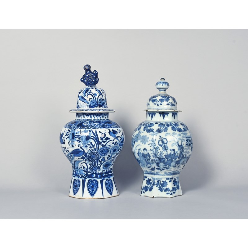 Two Delft vases and covers, 18th century, of octagonal baluster form, the smaller painted with Chinese figures and birds beneath trees in a garden setting, within formal leaf borders, marked for de porceleyn Schotel (the Porcelain Dish) manufactory, the other with peacocks and other birds among flowering plants, the domed cover with a lion dog finial, with a CK mark, some damages, 44.2cm max. (4)